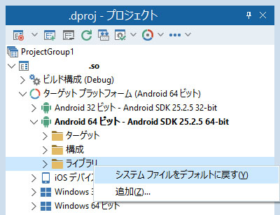具体的には、下の画面の通り、プロジェクトのターゲットプラットフォームで「Android 64 ビット」(または Android 32 ビット)を展開し、「ライブラリ」ノード上でマウスの右ボタンをクリックし、「システム ファイルをデフォルトに戻す」を実行します。