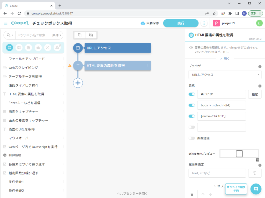 この「HTML要素の属性を取得」アクションにより、チェックボックスがチェックされているときには「true」が、チェックされていないときには「false」が返されます。